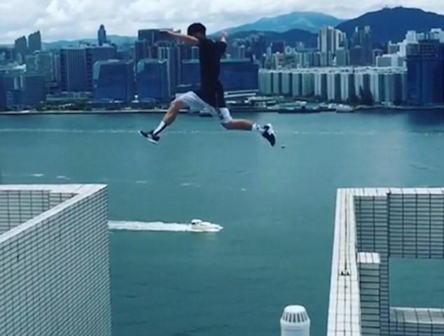 Chàng trai 24 tuổi dễ dàng nhảy qua hai tòa chung cư Provident Centre cao 25 tầng nằm trên đường Wharf, Hong Kong, dù điểm xuất phát và đích đến chỉ rộng khoảng 15 cm.