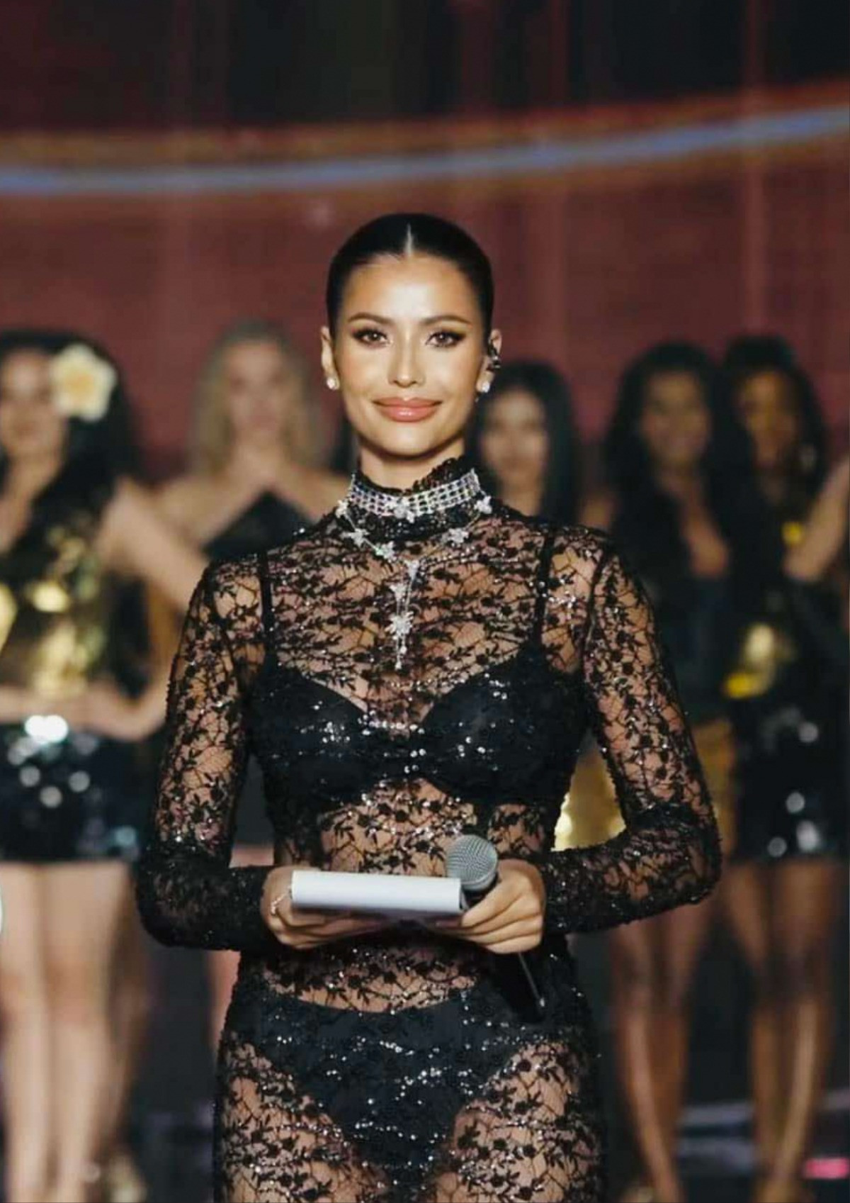 Tuy nhiên, nàng hậu mất điểm khi xuất hiện với bộ cánh phản cảm. Thiết kế váy tông màu đen chất liệu xuyên thấu ôm sát khiến cô để lộ rõ mồn một nội y. Dưới ống kính của ánh đèn flash, ở nhiều góc máy, tổng thể trang phục của cô được nhận xét không phù hợp với vai trò người dẫn dắt một đêm thi chung kết sắc đẹp mang tầm cỡ quốc tế.