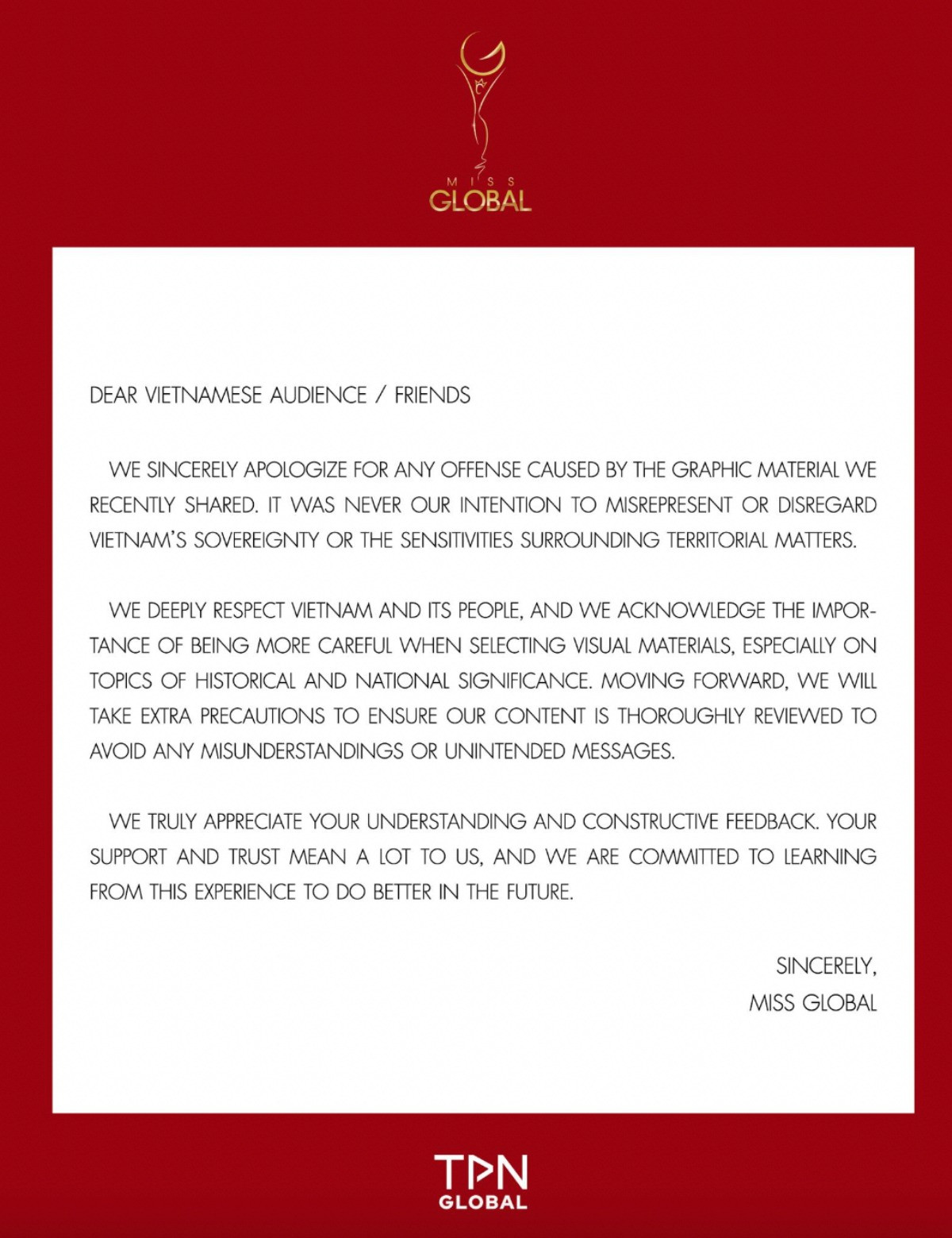 Chi tiết này đã gây bức xúc tột độ, khiến nhiều người tràn vào sóng livestream để tấn công và đòi tẩy chay cuộc thi. Trước làn sóng bất bình từ người hâm mộ Việt Nam, ban tổ chức Miss Global 2025 đã nhanh chóng đăng tải bài viết xin lỗi.