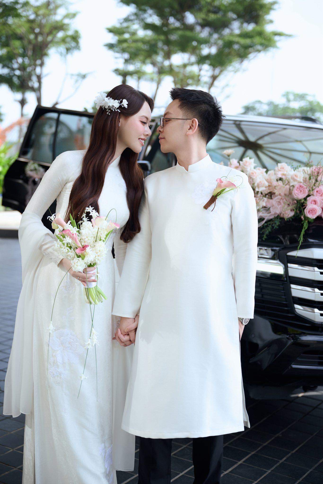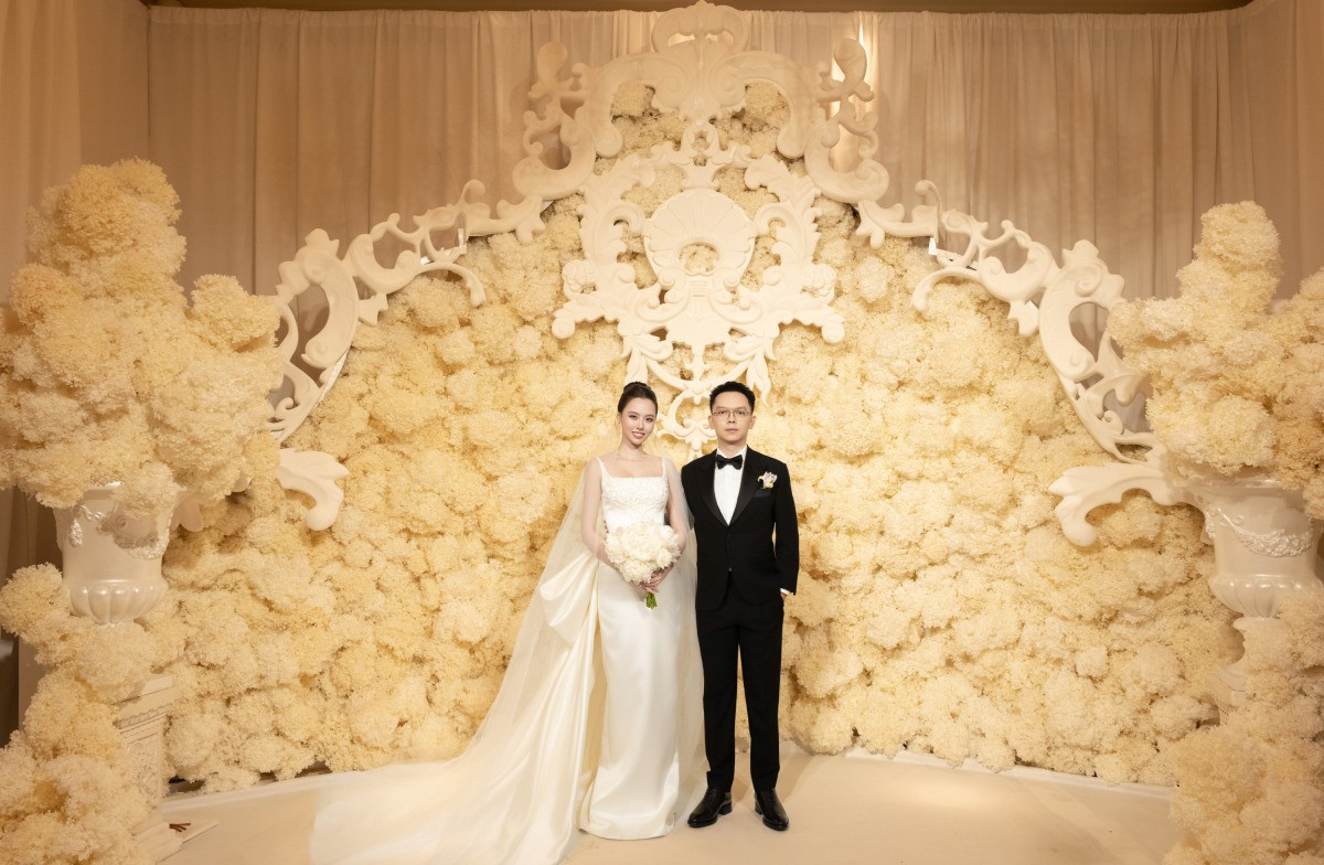 Không gian đám cưới được trang trí với tông trắng chủ đạo. Xuất hiện trong ngày trọng đại, Á hậu Tâm Như thay hai bộ váy cưới trắng khoe trọn nhan sắc xinh đẹp. Trong khi đó, chú rể diện suit đen lịch lãm. Cả hai được khen vô cùng xứng đôi dù chênh lệch tuổi tác 9 tuổi.