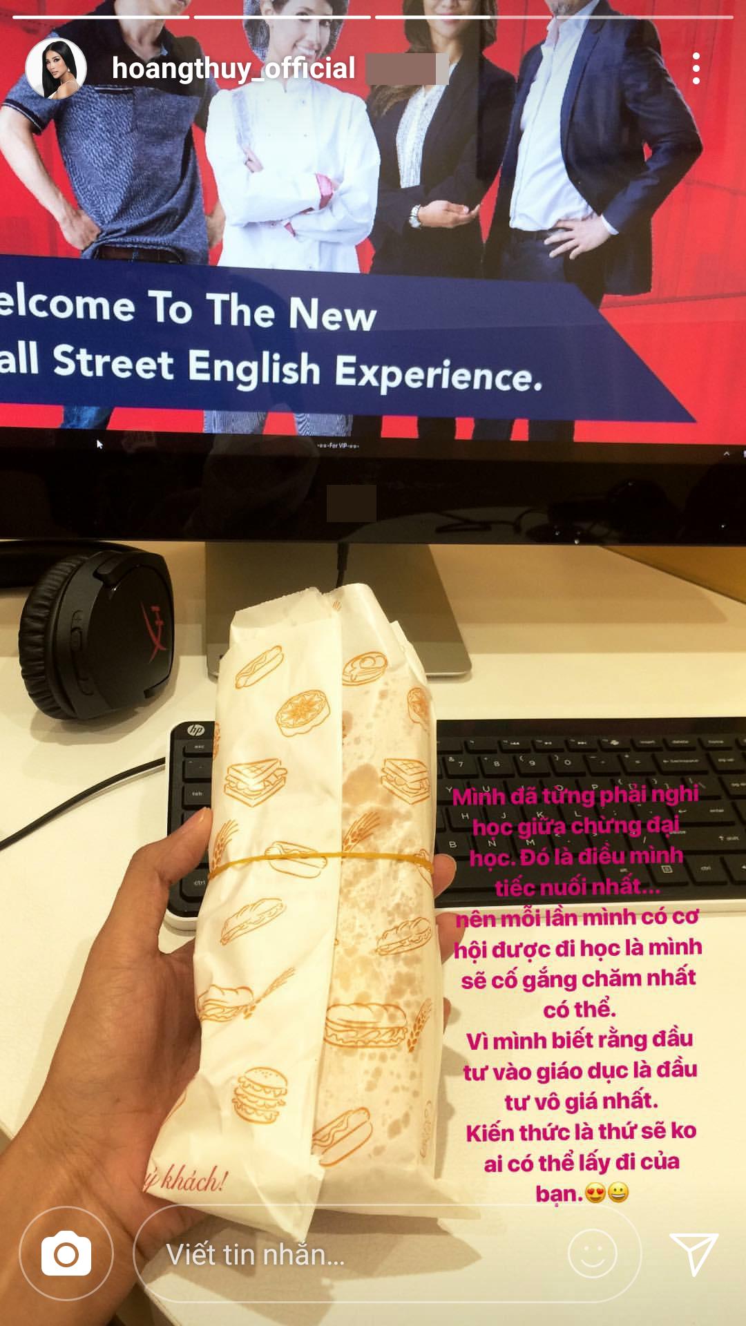 "Mình từng phải nghỉ học giữa chừng đại học. Đó là điều mình tiếc nuối nhất. Nên mỗi lần mình có cơ hội được đi học là mình sẽ cố gắng chăm nhất có thể. Vì mình biết rằng đầu tư vào giáo dục là đầu tư vô giá nhất. Kiến thức là thứ sẽ không ai có thể lấy đi của bạn", Hoàng Thùy trải lòng.