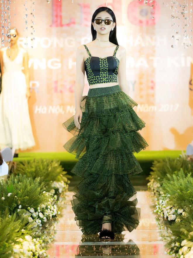 Set đồ giúp người đẹp khai thác những đường cong quyến rũ, đặc biệt là vòng eo con kiến đáng ngưỡng mộ. Chiếc kính râm khiến Á hậu trông cực ngầu trên sàn catwalk.