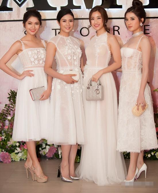 Cũng tại sự kiện, xuất hiện trên thảm đỏ thời trang, dàn mỹ nhân Việt diện thiết kế váy tông trắng tinh khôi thu hút mọi ánh nhìn. Phụ kiện trang sức cùng chiếc clutch ton-sur-ton khiến ai cũng tỏa sáng.