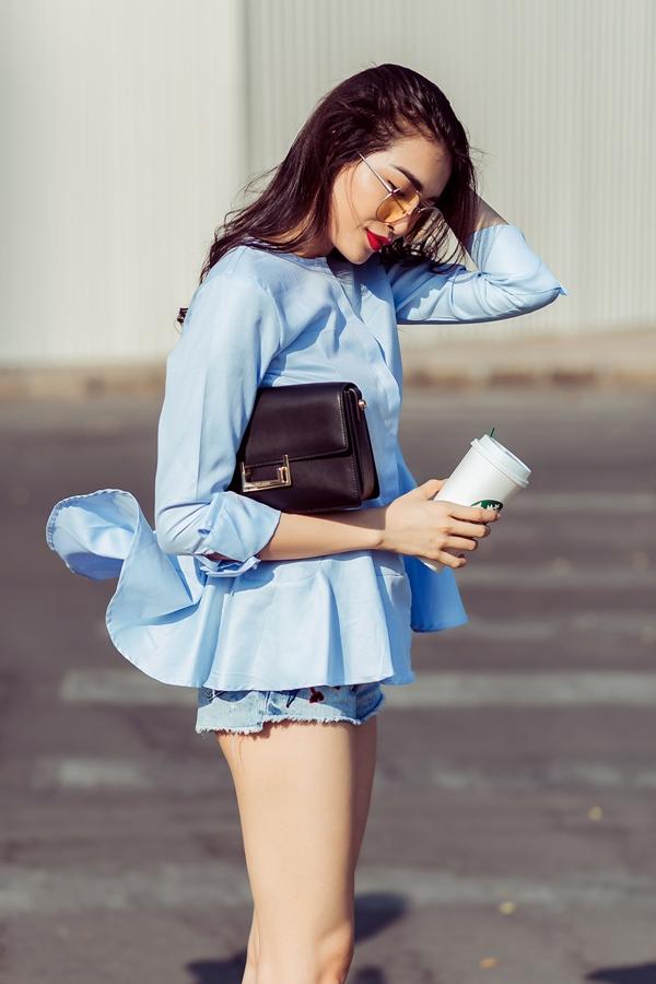 Quán quân Elite Model Look chọn phong cách thanh lịch với thiết kế sơ mi xanh baby, hay được biết với tên gọi xanh pastel. Thiết kế áo không cổ, tay lửng, túm eo và xòe phần đuôi phù hợp cho vóc dáng cân đối của Lệ Hằng. Mũ gaucho rộng vành và kính râm trong suốt màu vàng là hai item thời thượng được Lệ Hằng chọn diện trong set đồ casual này.