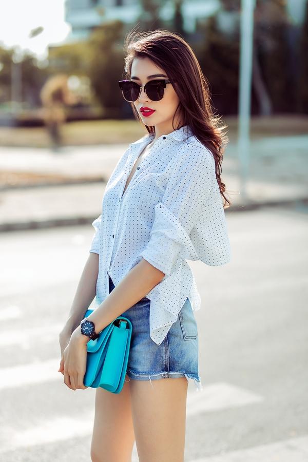 Trong bộ cánh đầu tiên, Á hậu HHHV Việt Nam 2015 khoe làn da trắng ngần với bộ trang phục tông xanh sáng. Thiết kế áo hai dây bản to bằng chất liệu ren lưới được cô mix đơn giản cùng quần short jeans thêu họa tiết popart. Bộ cánh đậm chất mùa hè phối với phụ kiện túi hộp mini đính trang trí.