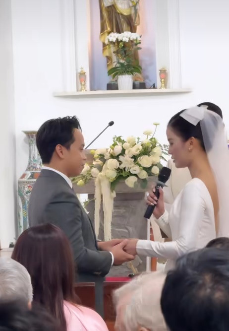Trong không khí ấm cúng tại nhà thờ, cô dâu diện đầm cưới màu trắng chất liệu vải trơn, đầu đội khăn voan khoe nhan sắc rạng rỡ, tươi tắn. Trong khi đó, chú rể Tùng Anh diện suit lịch lãm.