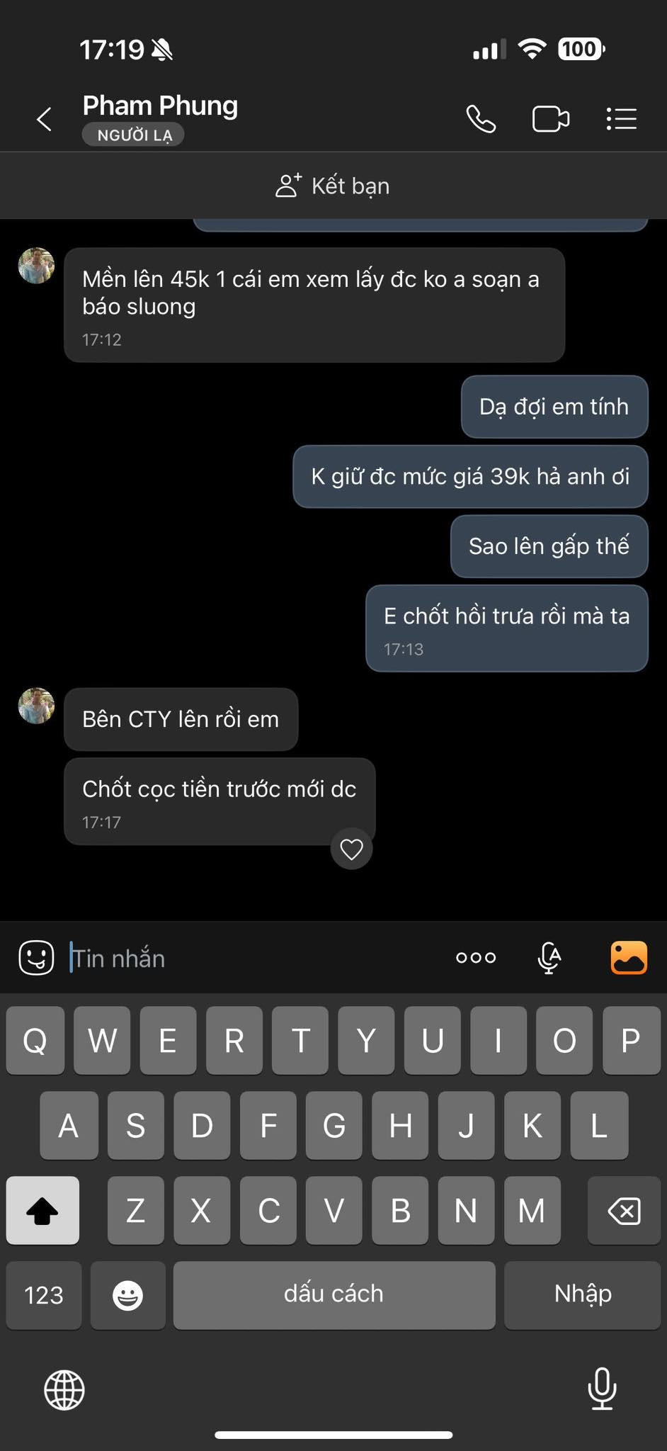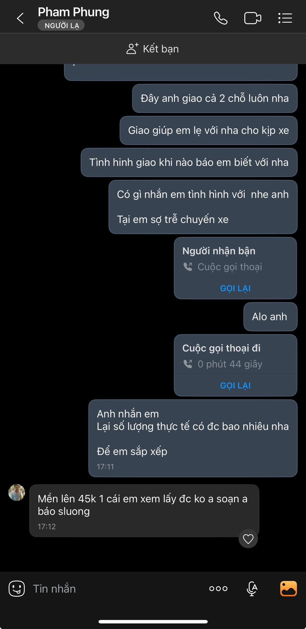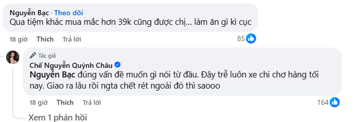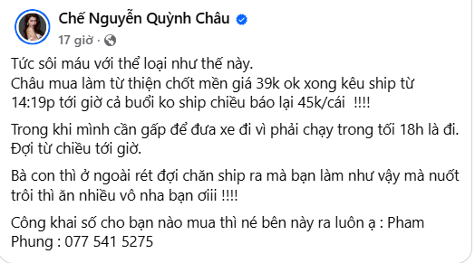Quỳnh Châu tức giận chia sẻ: "Tức sôi máu với thể loại như thế này. Châu mua làm từ thiện chốt mền giá 39k ok xong kêu ship từ 14:19p tới giờ cả buổi ko ship chiều báo lại 45k/cái. Trong khi mình cần gấp để đưa xe đi vì phải chạy trong tối 18h là đi. Đợi từ chiều tới giờ. Bà con thì ở ngoài rét đợi chăn ship ra mà bạn làm như vậy mà nuốt trôi thì ăn nhiều vô nha bạn ơi". Đính kèm theo đó là loạt ảnh chụp lại màn hình tin nhắn với người bán.