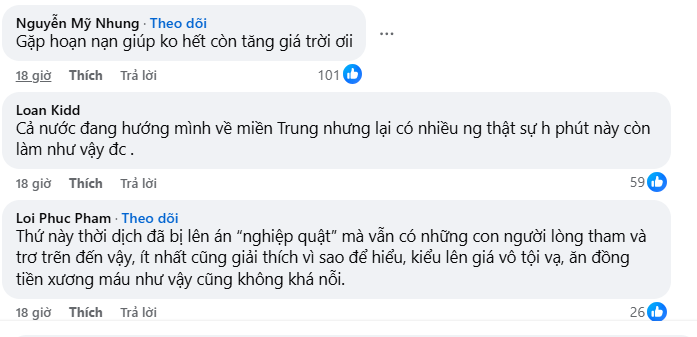 Dưới phần bình luận, đông đảo đồng nghiệp và cư dân mạng đều bày tỏ sự bức xúc. Đa phần mọi người cho rằng hành vi kinh doanh này là trục lợi, ép giá giữa thời điểm thiên tai khốc liệt.