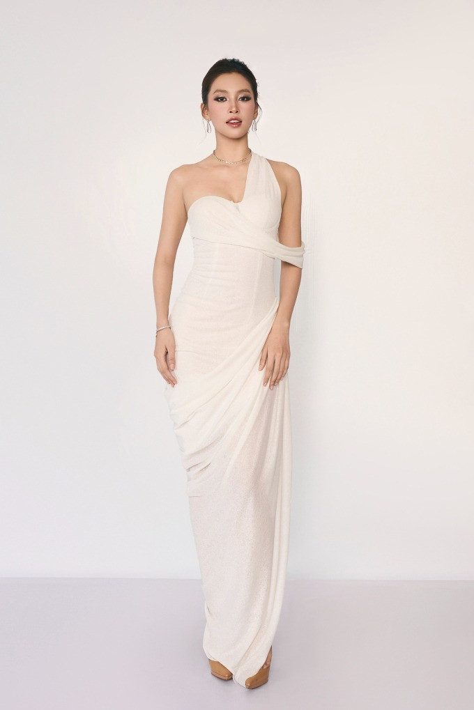 Hoa hậu Tiểu Vy lọt top sao mặc đẹp khi lựa chọn đầm trắng bất đối xứng khoe vai trần nõn nà.