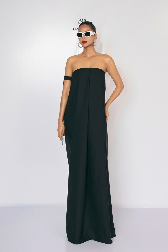 Mẹ bầu H'Hen Niê giấu bụng siêu đỉnh khi lựa chọn thiết kế đầm đen tối giản, sang trọng.