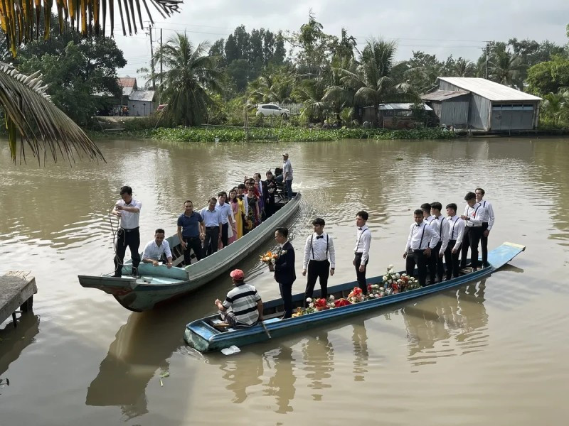 Đám cưới của người đẹp An Giang còn gây chú ý khi mang đậm chất miền Tây. Chú rể Ngọc Duy đã chèo xuồng băng qua sông mang sính lễ khủng 13 cây vàng gồm vòng cổ, vòng tay, dây chuyền, nhẫn,... đeo kín người bà xã xinh đẹp.
