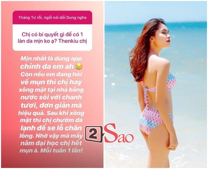 Bí kíp để sở hữu làn da mịn màng của Thùy Dung là... dùng app chỉnh da. Tuy nhiên, để có một làn da thực sự sạch mụn, người đẹp đã từng thử xông mặt tại nhà với nước sôi vắt chanh tươi rồi chườm đá lạnh để se lỗ chân lông mỗi tuần một lần. Nhờ đó, cô sở hữu làn da khỏe mạnh suốt 4 năm đại học.