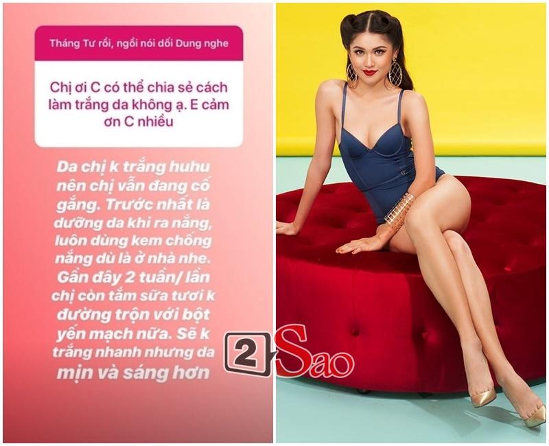 Tuy không sở hữu làn da trắng nhưng mỹ nhân sinh năm 1996 vẫn đang cố gắng khi luôn dùng kem chống nắng (dù là ở nhà) và tắm với hỗn hợp sữa tươi không đường trộn với bột yến mạch. Đây là cách làm trắng da an toàn, tuy chậm nhưng cũng khá hiệu quả.