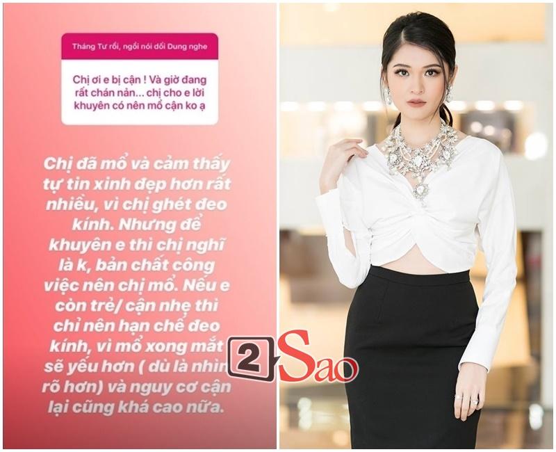 Thùy Dung cũng tư vấn luôn cho một fan đang băn khoăn về mổ cận. Cô cho rằng nếu còn trẻ và cận nhẹ thì không nên mổ vì mổ xong mắt sẽ yếu và nguy cơ cận lại cũng khá cao.