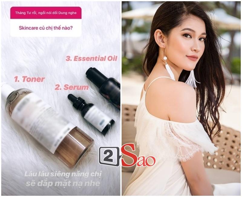Chu trình dưỡng da được Thùy Dung tiết lộ cũng khiến rất nhiều người bất ngờ. Á hậu chăm sóc đơn giản với 3 bước: nước hoa hồng (toner), serum và dầu dưỡng (essential oil). Đắp mặt nạ chỉ là bước bổ sung khi cô cảm thấy "siêng năng" bất chợt.