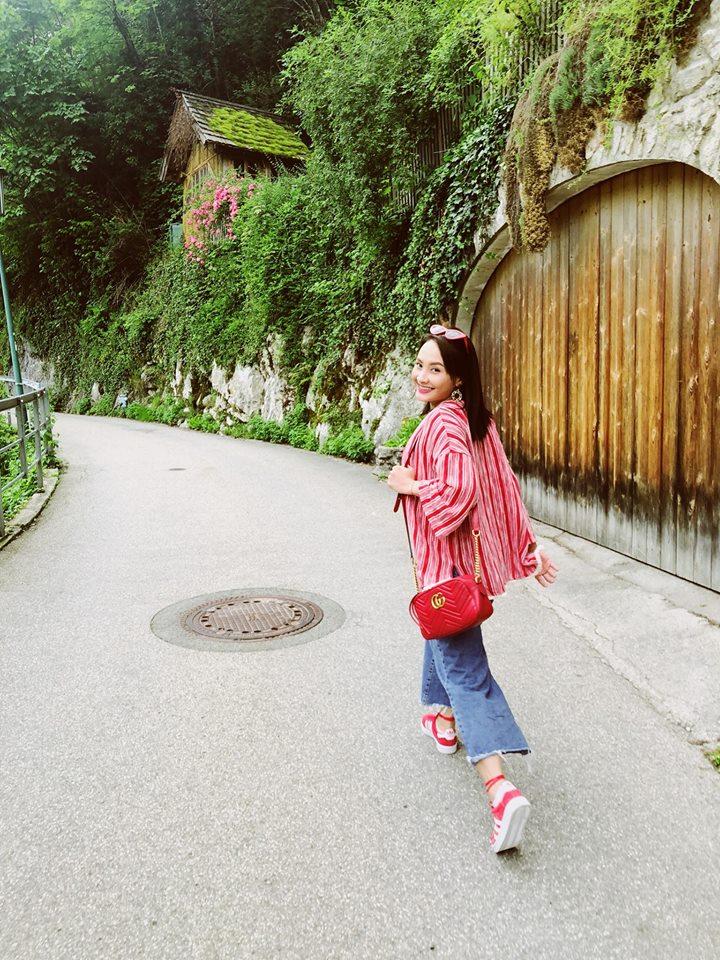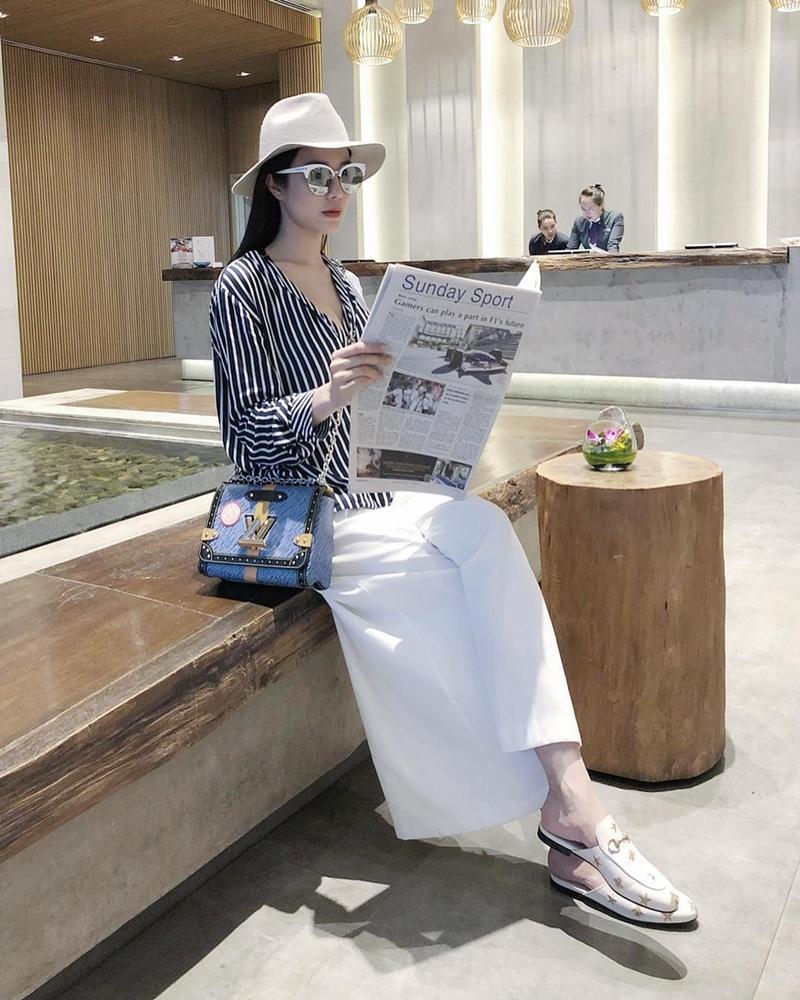 Diệp Lâm Anh sang chảnh dát hàng hiệu từ đầu đến chân cùng áo sơ mi, quần cullote, túi LV, giầy mule Gucci.