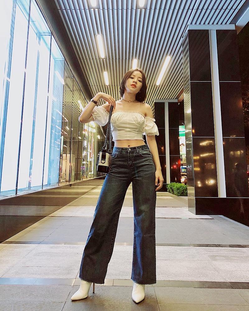 Chi Pu khoe eo thon cùng chiếc áo croptop điệu đà đang "làm mưa làm gió" hiện nay. Mỹ nhân sinh năm 1993 khéo léo phối với quần jeans cạp cao, boots mũi nhọn, túi Chanel đắt đỏ.