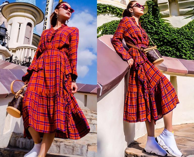 Diện đầm midi kẻ ô vuông bay bổng, Minh Hằng chấm phá set đồ với giày thể thao năng động của Balenciaga, xách túi bucket Louis Vuitton đắt giá .