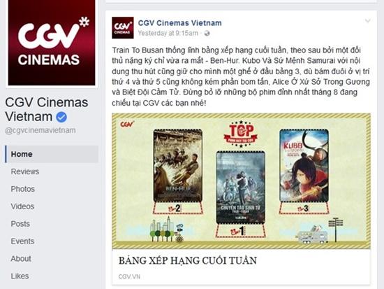 Mới nhất, đơn vị phát hành Galaxy thông báo Train to Busan - bộ phim kinh dị mang đề tài xác sống của Hàn Quốc mới chạm mốc 30 tỷ đồng sau 10 ngày trình chiếu (từ 12/8). Đây cũng là một tác phẩm điện ảnh được công chúng Việt quan tâm, nhận được nhiều phản hồi tích cực từ khán giả, và có mặt tại cả CGV lẫn nhiều chuỗi rạp khác.