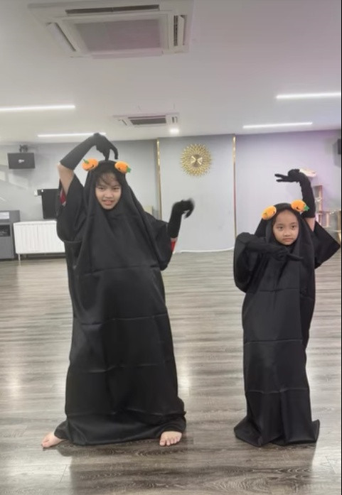 Trong khi đó, cậu cả Kubi và chị hai Anna lại hóa thân nhân vật Vô Diện một cách hài hước. Cả hai không quên tạo dáng lầy lội trước ống kính. Dù Halloween chưa đến nhưng không khí lễ hội đã ngập tràn trong gia đình Khánh Thi - Phan Hiển.