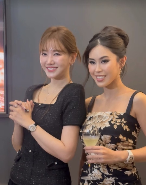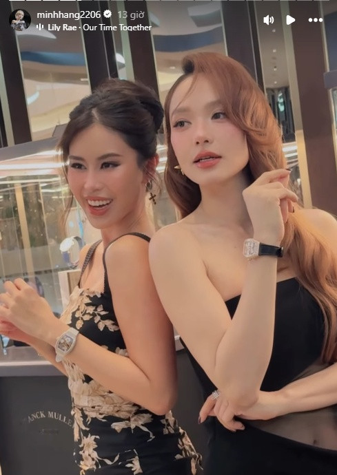 Trong khi đó, "phú bà" Minh Hằng gợi cảm với đầm xuyên thấu, phom cúp ngực khoe vóc dáng "mẹ một con trông mòn con mắt". Minh Hằng cũng lựa chọn đồng hồ cùng thương hiệu với Tiên Nguyễn.