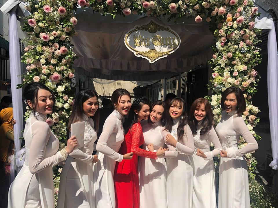Còn trước đó ở buổi rước dâu, Ái Phương cùng Hoàng Oanh và nhóm bạn thân chơi chung với cô dâu đã hóa thành những cô phù dâu lần đầu bưng quả.