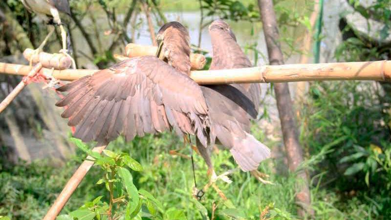 Một đàn chim bị khâu mắt, buộc chân vào các thanh tre để nhử đàn chim khác dính bẫy