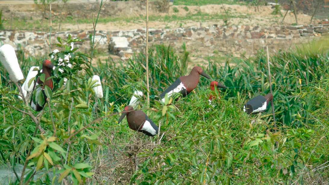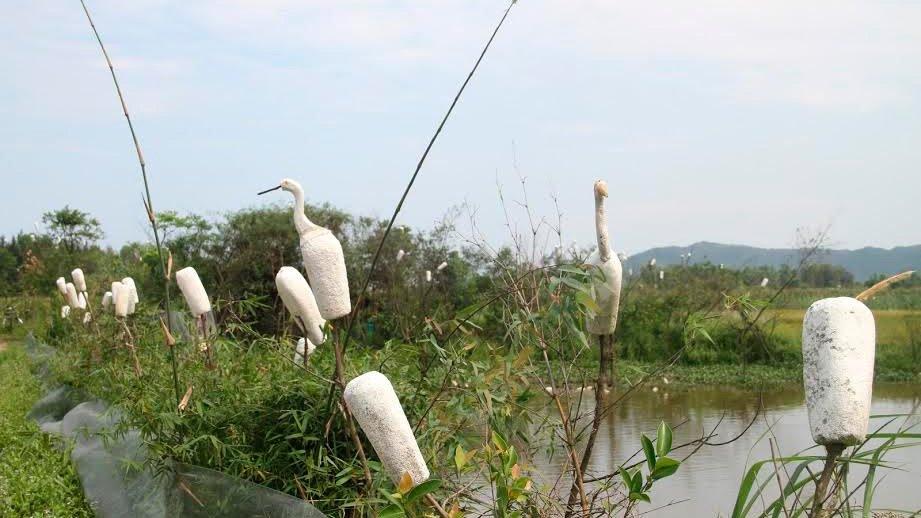 Cò giả được làm bằng chất liệu xốp cắm chi chít ở cánh đồng
