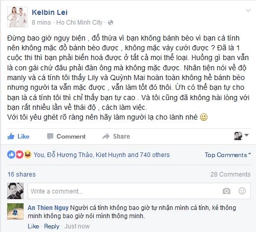 Tuy nhiên, không chỉ có mình Kelbin Lei bày tỏ quan điểm của mình mà An Nguy cũng 'đá' thí sinh này một câu rằng: "Người cá tính không bao giờ tự nhận mình cá tính, kẻ thông minh không bao giờ nói mình thông minh". Bình luận của An Nguy nhanh chóng nhận được sự hưởng ứng của cư dân mạng, thậm chí Lê Hà, Lilly cũng hài lòng với câu nói này. Stylist Travis Nguyễn còn nói thêm rằng thái độ của thí sinh ấy luôn là như vậy chứ không phải chỉ bộc phát trong cuộc thi.