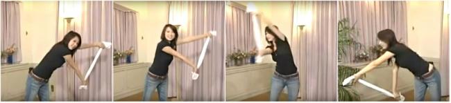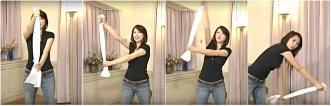 1. Đầu tiên đứng thẳng, hai chân dang rộng bằng vai. Nắm 2 đầu của khăn theo chiều dọc sau đó nghiêng người qua phải. Tiếp đến vòng tay lên trên, tạo thành nửa vòng tròn, sau đó di chuyển cánh tay về phía bên trái.
