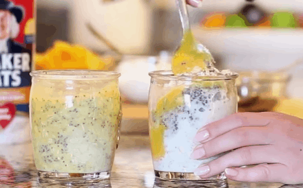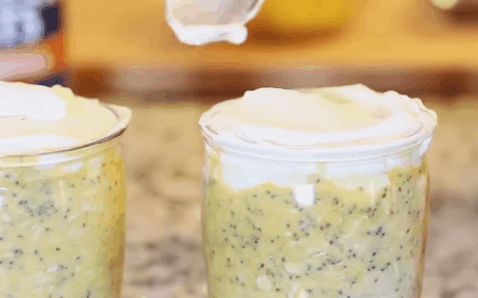 - Cuối cùng, bạn múc 1 lớp sữa chua Hy Lạp đặt lên trên hỗn hợp yến mạch và xếp các miếng xoài cắt lên. Đặt hỗn hợp vào tủ lạnh qua đêm là có thê thưởng thức rồi.