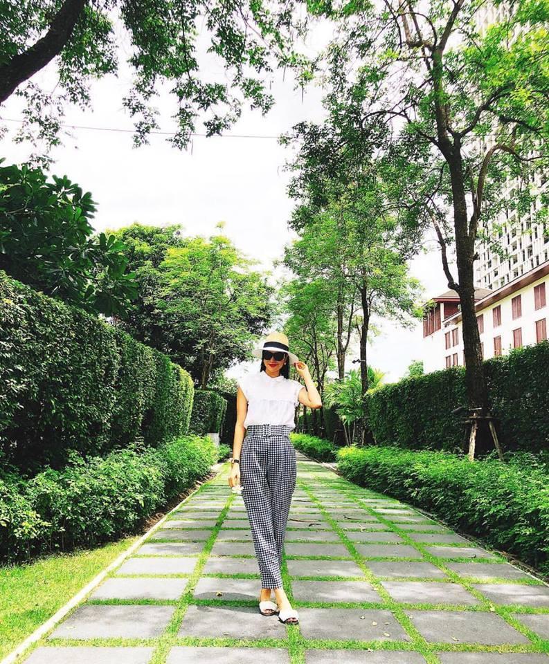 Phạm Hương giản dị cùng áo sơ mi trắng kết hợp quần kẻ caro cạp cao, dép lê bệt thoải mái.