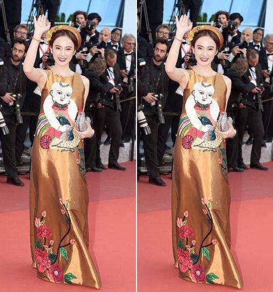 Angela Phương Trinh diện váy họa tiết tranh đông hồ tới LHP Cannes 2016.