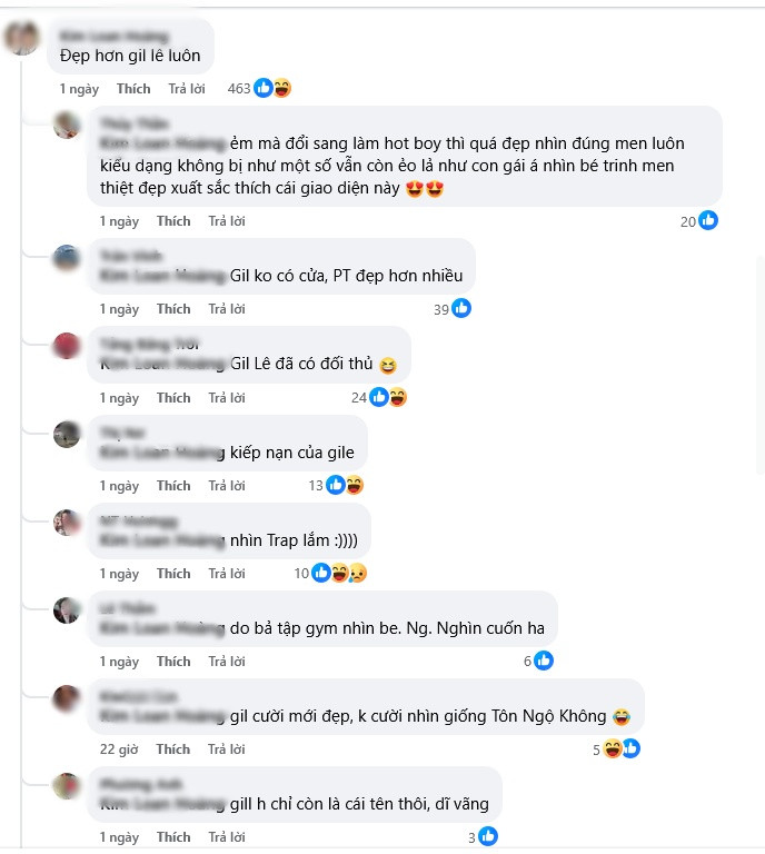 Nhiều người để lại bình luận trái chiều. Người thì khen ngợi dành những lời có cánh cho nữ diễn viên: "Đẹp trai quá", "Đẹp phi giới tính luôn chị ơi", "Diện mạo mới của Trinh men quá, đẹp hơn Gil luôn ta ơi", "Đẹp hơn Gil Lê luôn", "Gil Lê chỉ còn là cái tên"...
