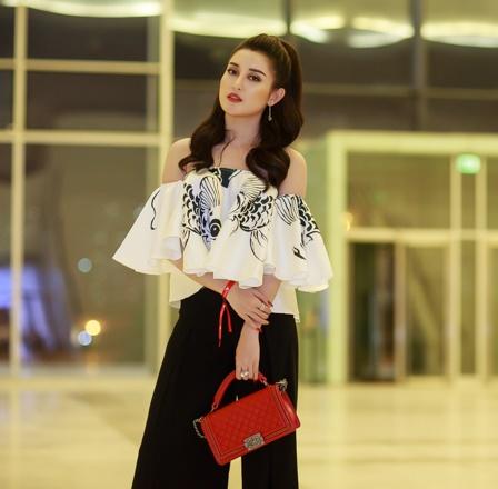 Để tăng nét cá tính và hiện đại cho tổng thể set đồ, Huyền My lựa chọn tóc búi cao với phần đuôi xoăn sóng. Phụ kiện kèm theo là túi Channel bắt mắt.