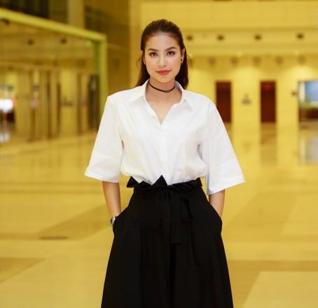 Trong khi đó, Phạm Hương thanh lịch với áo sơ-mi trắng, chân váy midi dáng xòe tối màu.