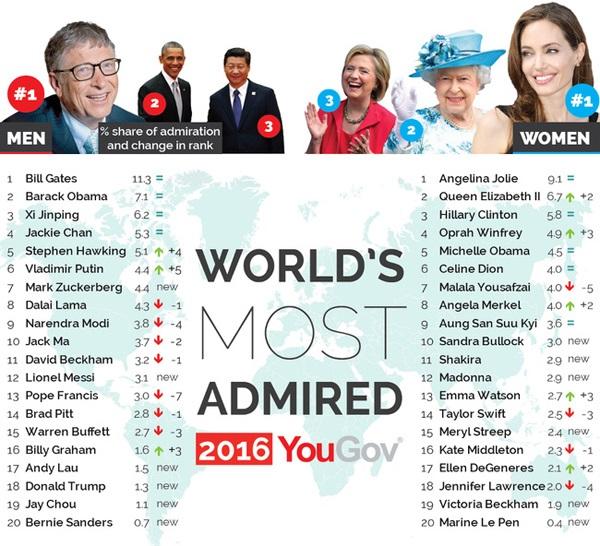 Ở bảng xếp hạng của nam, tỷ phú Bill Gates dẫn đầu danh sách những người đàn ông được ngưỡng mộ nhất thế giới trong năm 2016. Tiếp theo là Tổng thống Mỹ Barak Obama và Chủ tịch Trung Quốc Tập Cận Bình. Ngôi sao võ thuật Thành Long đứng ở vị trí thứ 4 trong bảng xếp hạng.