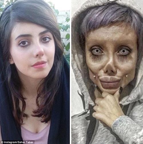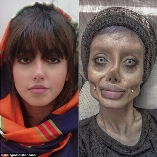Cũng cặp mắt sâu và to, cũng đôi môi dày cộp, cũng gò má cao nhưng Sahar Tabar khiến người ta hoảng sợ bởi bộ dạng tong teo, hốc hác. Có thông tin cho rằng cô đã trải qua 50 cuộc phẫu thuật thẩm mỹ cũng như giảm cân điên cuồng để có được ngoại hình như nữ diễn viên từng đoạt Oscar song thật tiếc, mọi chuyện đã đi quá xa. Thay vì xinh đẹp và quyến rũ như Angelina Jolie, Sahar Tabar lại đem tới cảm giác rùng rợn như nhân vật chính trong phim Cô dâu ma.