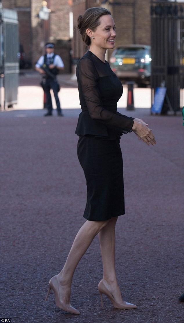 Nữ diễn viên 41 tuổi thanh lịch trong bộ váy đen phối vải sheer dài tới gối, tóc búi cao gọn gàng. Cô được Phó mưu trưởng Quốc phòng Anh Gordon Messenger chào đón.
