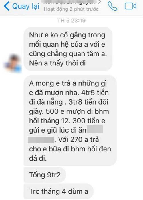 Tổng cộng số tiền anh muốn đòi lại là 9,2 triệu đồng và thời hạn cô gái phải trả là trước tháng 4. Ngoài ra, thanh niên này còn đòi cả những thứ lặt vặt khác như: cục sạc dự phòng, dây sạc… với lý do hài hước “cái gì tặng là tặng, cái nào mượn là mượn”.