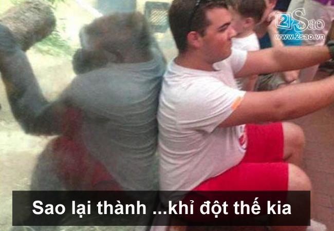 Hình ảnh hài hước trùng hợp đến bất ngờ, khi chú khỉ đột ở bên kia cũng ngồi ngay sát... chàng trai