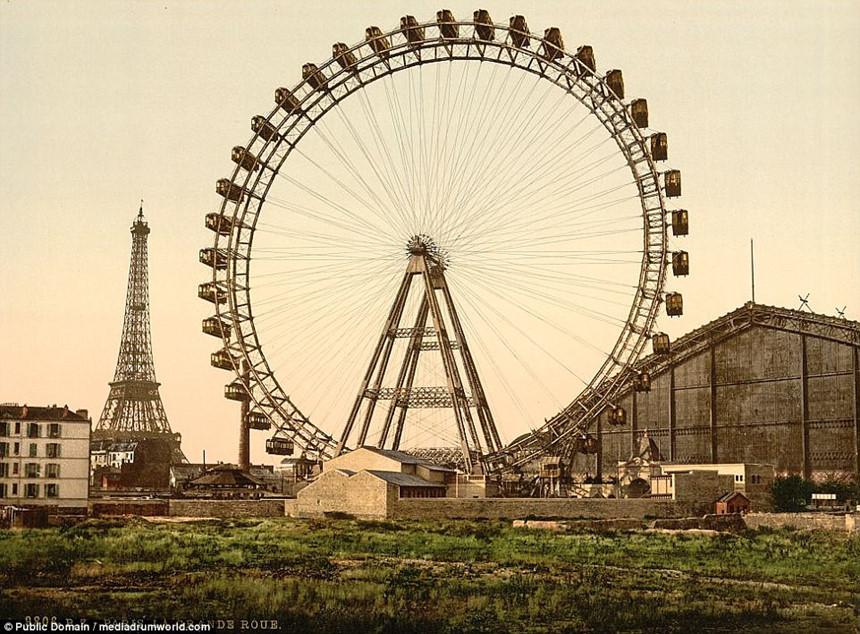 Bộ ảnh về nước Pháp từ cuối thế kỷ 19 cho thấy các địa danh nổi tiếng đã xuất hiện cách đây hơn 100 năm. Nhiều công trình, địa điểm vẫn không thay đổi cho đến ngày nay góp phần thu hút hàng chục triệu khách du lịch đến Pháp mỗi năm. Trong ảnh là Grande Roue de Paris, bánh xe đu quay cao 100 m được xây dựng gần tháp Eiffel vào năm 1900 cho Triển lãm Thế giới tại Paris. Vào thời điểm hoàn thành, nó là bánh xe đu quay cao nhất thế giới. Sau 20 năm tồn tại, bánh xe đu quay được dỡ bỏ vào năm 1920.