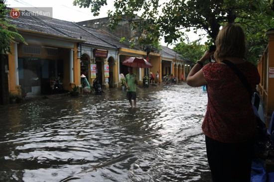 Nhiều du khách nước ngoài thích thú chụp hình phố cổ Hội An ngập nước