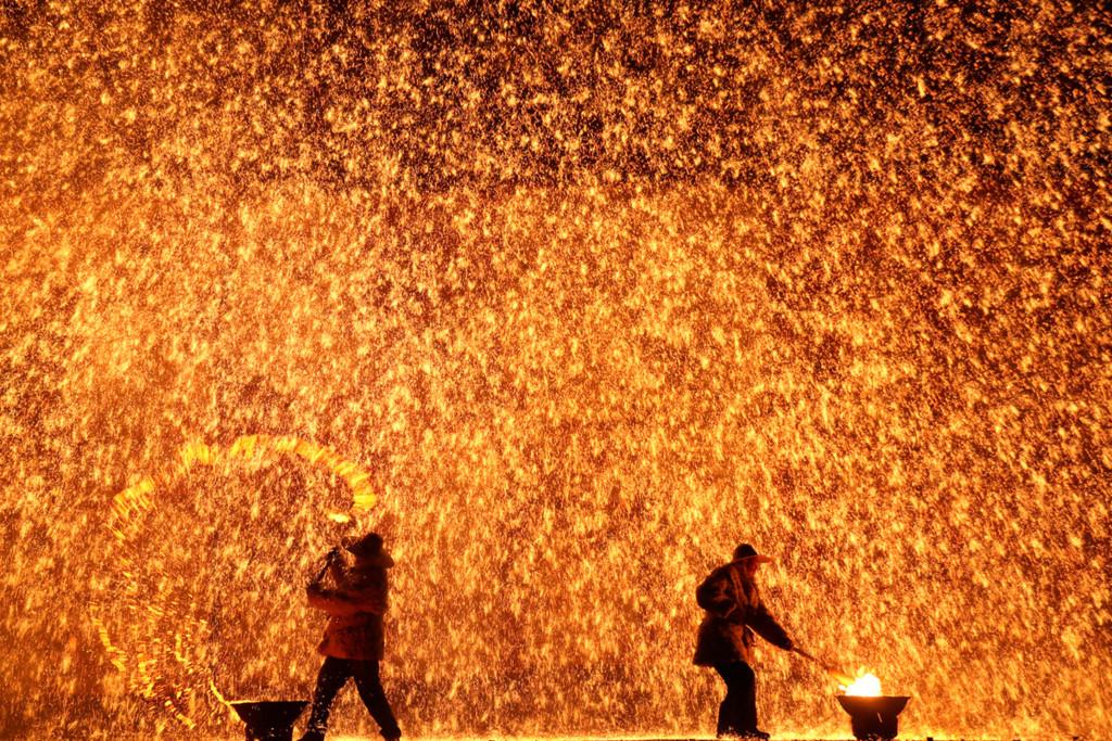Lễ hội Thuyền Rồng: Sắt nóng chảy được ném vào tường để tạo ra tia lửa trong một buổi trình diễn truyền thống trước lễ hội Thuyền Rồng ở Trương Gia Khẩu, tỉnh Hà Bắc, Trung Quốc vào ngày 29/5 . Ảnh: China Daily/Reuters.