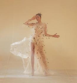 Thực hiện bộ ảnh để hoài niệm về thời còn làm mẫu, Anh Thư chọn trang phục xuyên thấu đính lông vũ của NTK Lê Thanh Hòa.
