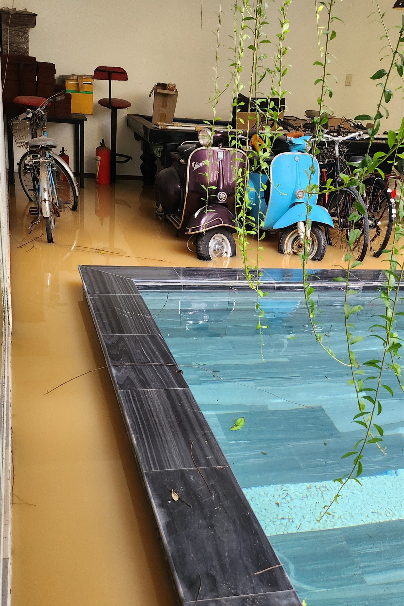 Không ngờ sau một đêm, nước ngập lênh láng ngôi nhà, thậm chí cao hơn 60cm so với năm 2020. Vợ chồng nữ danh ca vất vả đưa chú heo nặng 309kg đến nơi cao hơn, 14 con chó lên lầu, sau đó tranh thủ kê cao 5 cái tủ lạnh và 1 cái ghế mát-xa.