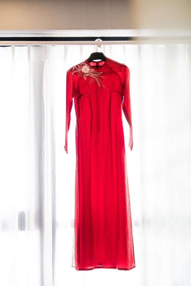 Chiếc áo dài đỏ được thiết kế theo lối truyền thống Hà Nội với cổ cao cùng những đường cắt xẻ tinh tế. Điểm xuyết trên vai áo là hoạ tiết đính hoa đá kết hợp cùng những khâu tay tỉ mỉ cho thấy sự kỳ công trong khâu chọn lựa trang phục của người đẹp.