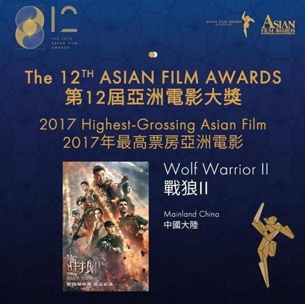 Movie “Chiến lang 2” với giải thưởng “Bộ phim có doanh thu phòng vé cao nhất Châu Á”. Đây là giải thưởng “nghiễm nhiên” thuộc về “Chiến Lang 2” khi doanh thu bộ phim đạt kỷ lục tại doanh thu Trung Quốc lẫn Châu Á.