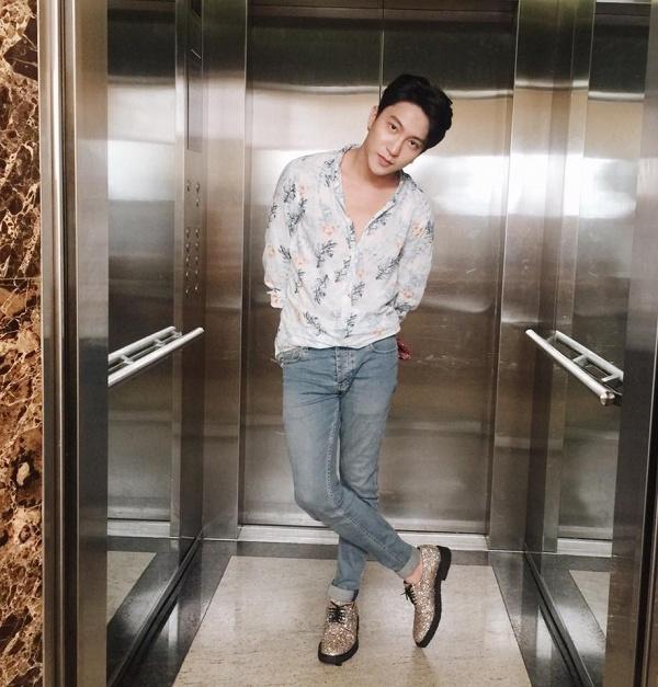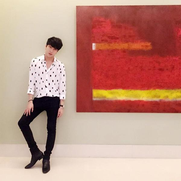 Hay áo sơmi trắng in nổi bông hoa hồng này đã minh chứng cho gu thời trang đậm chất lãng tử của anh chàng.