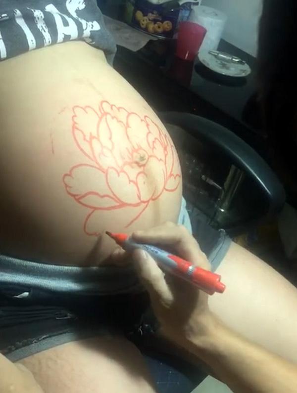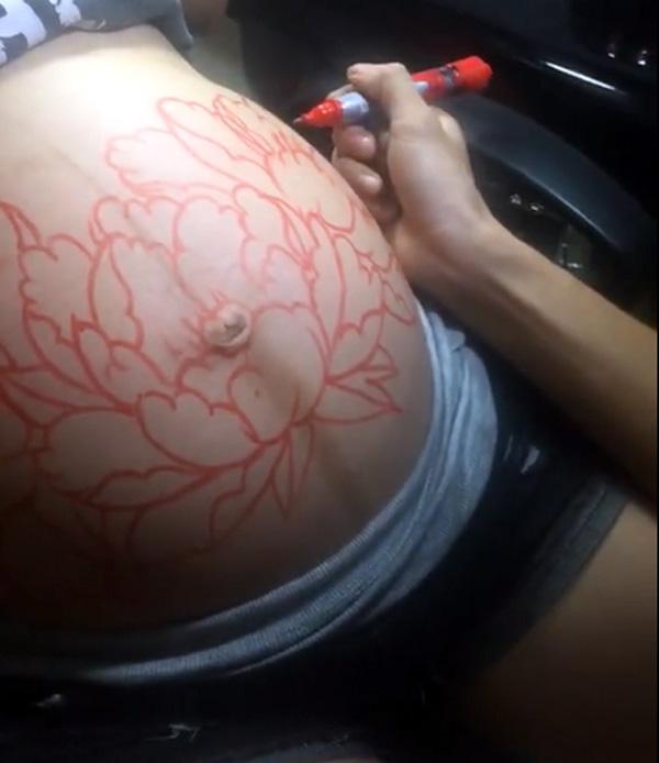 Theo như đoạn clip dài hơn 40 phút này ghi lại, một bà bầu (giấu mặt) bụng đã to (nhiều người đoán thai kỳ khoảng trên 6 tháng) quyết định xăm hình một bông hoa mẫu đơn ở bụng mà không hề có chút do dự hay phân vân gì. Trong suốt quá trình xăm, bà bầu này còn tỏ ra rất thoải mái, không hề phàn nàn, kêu cả một tiếng nào.
